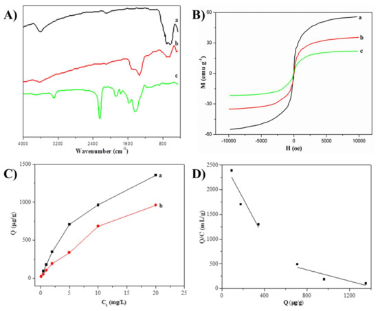 (A) FT-IR spectra of Fe3O4 (a), Fe3O4@SiO2 (b) and MDMIPs (c); (B) Magnetization curves for Fe3O4 (a), Fe3O4@SiO2 (b), and MDMIPs (c); (C) Melamine adsorption isotherms of MDMIPs (a) and MDNIPs (b); (D) Scatchard analysis of melamine adsorption by MDMIPs.