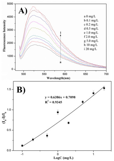 (A) Fluorescence spectra of FITC-Mel with different concentrations of melamine and (B) Standard calibration plots of (I – I0)/I0 against the logarithm of the melamine concentration from 0.1 to 20 mg/L in milk samples.