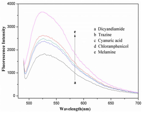 To investigate method selectivity, some common potential interfering substances such as dicyandiamide, trazine, cyanuric acid and chloramphenicol were tested by conducting experiments at the same concentration (1.0 mg/L). As shown in Figure 6, only melamine could induce a considerable change of the fluorescence signal at 526 nm. No dramatic changes at 526 nm were observed in the presence of dicyandiamide, trazine, cyanuric acid and chloramphenicol.