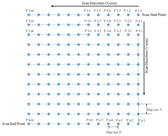 Each sample was held immobile in the two-stage moving platform. An exposure time of 1 s and laser power of 120 mW was used for collection of spectral signal. Figure 1 shows the process of acquiring the spectral image by the point-scan method. The process is a row-wise scan. After collecting Raman spectrum from a point, the sample is moved horizontally (X-axis) with a 0.25 mm increment to the next point. After completing the Raman spectral measurement from the first row, the sample is moved vertically (Y-axis) to the next row with a 0.25 mm increment. The process was repeated to collect Raman spectra across the 25 mm × 25 mm surface area of the sample. The Raman spectra were accumulated spatially to construct a hyperspectral image of the sample. The final sample image was a 100 × 100 × 512 hyperspectral cube with 10,000 spatial pixels, each of 512 spectral wavenumbers. One hyperspectral cube was constructed for each mixture sample. Prior to acquisition of Raman spectra, a dark current spectrum was acquired with the laser off and a cap covering the probe. The dark current spectrum was subtracted from the Raman spectrum at each pixel during spectral measurement.