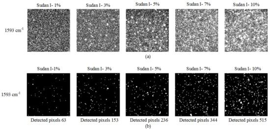 Figure 4a shows the raw hyperspectral Raman images of curry powder–Sudan I mixed samples across five concentration levels at 1593 cm−1. At 1593 cm−1, peak intensity of Sudan-I is higher than the peak intensity of curry powder. This information was used to create binary detection image for identification of Sudan-I pixels. An initial spectral intensity threshold value was set and all pixels with a spectral intensity below the threshold value were converted to background pixels (curry powder). All the pixels above the set threshold value were converted to white pixels representing Sudan-I. For a higher-intensity threshold value, some of the Sudan-I pixels had a spectral intensity lower than the threshold value. These pixels were also converted into background pixels (false negative). For a significantly lower-intensity threshold value, some of the curry powder pixels were misinterpreted as the Sudan-I pixels (false positive). To avoid the false-positive and false-negative cases, pixel-by-pixel evaluation of spectral pixels was performed. Each pixel was evaluated with its corresponding spectra to select the appropriate intensity threshold value. Based on the pixel-by-pixel evaluation, a final threshold value of 550 was set to obtain a binary detection image. All the pixels with intensities below 550 were converted to background pixels. The remaining pixels represent the Sudan-I pixels. Figure 4b shows the 1593 cm−1 binary detection images of samples at five concentrations. The white pixels are scattered throughout the sample surface. The number of white pixels is low in the 1% Sudan-I image, and progressively increases in the 3%, 5%, 7%, and 10% images. A gradual increase in the white pixels from 1% to 10% indicate more Sudan-I particles were detected at increasing concentration. A total of 63, 153, 236, 344, and 515 Sudan-I pixels were detected in the 1593 cm−1 binary detection images of 1%, 3%, 5%, 7%, and 10% concentration samples.