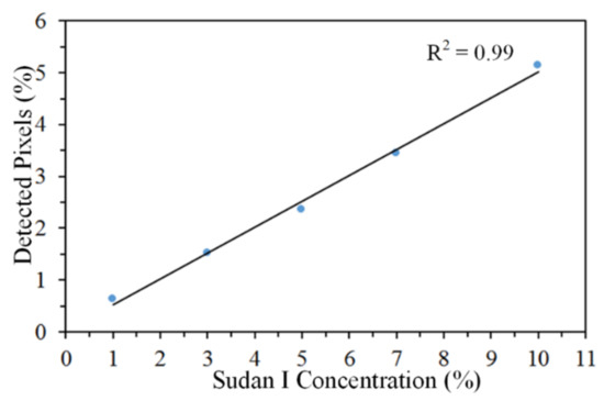 The progressive increase in the detected Sudan-I pixels (Figure 4b) indicates that the percentage of detected pixels and sample concentration are correlated. The 515 pixels detected in 10% sample corresponds to 5.15% of total acquired pixels. Similarly, the 63 pixels detected in 1% sample corresponds to 0.63% of total acquired pixels. The percentage of the detected pixels are linearly correlated with the Sudan-I concentration in the samples with a correlation coefficient of 0.99 (Figure 6).