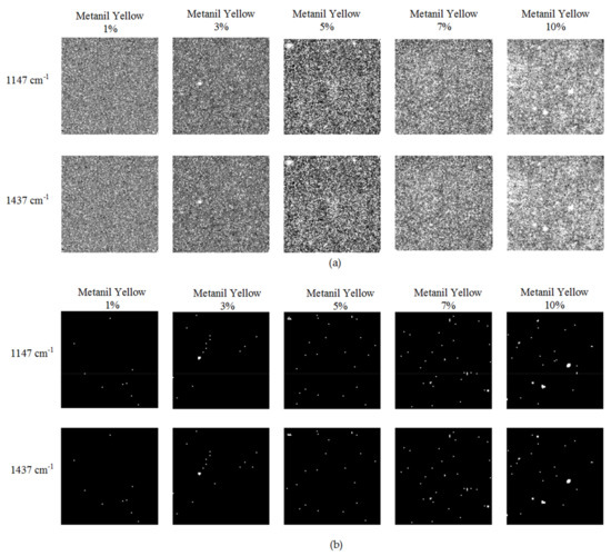 Figure 7a shows the hyperspectral Raman images of curry powder–metanil yellow mixture samples at 1147 cm−1 and 1437 cm−1 across five concentration levels. The 1147 cm−1 and 1437 cm−1 are the highest intensity metanil yellow peaks. The peak intensity of metanil yellow was found to be higher than curry powder peak intensity at 1147 cm−1 and 1437 cm−1. Intensity threshold value of 525 was selected based on pixel-by-pixel analysis of all spectral pixels to obtain binary detection images. All the pixels with intensities below 525 were converted to background pixels. The remaining pixels represent the metanil yellow pixels. Figure 7b shows the 1147 cm−1 and 1437 cm−1 binary detection images of samples at five concentrations. The white pixels are scattered throughout the sample surface. The number of white pixels is low in the 1% metanil yellow image, and progressively increases in the 3%, 5%, 7%, and 10% concentration images. A gradual increase in the white pixels from the 1% to 10% image indicates more metanil yellow particles were detected at increasing concentrations. A total of 9, 21, 30, 43, and 57 metanil yellow pixels were detected in the 1147 cm−1 binary detection images of 1%, 3%, 5%, 7%, and 10% concentration samples. Similarly, 9, 22, 28, 43, and 55 metanil yellow pixels were detected in the 1437 cm−1 binary detection images of 1%, 3%, 5%, 7%, and 10% concentration samples. The metanil yellow pixels have similar spatial distribution in both the binary images. Figure 8 shows the Raman spectra of detected metanil yellow pixels at 1%, 3%, 5%, 7%, and 10% concentration samples. In the figure, the 10% metanil yellow consists of 57 spectra, while the 1% metanil yellow consists of 9 spectra.
