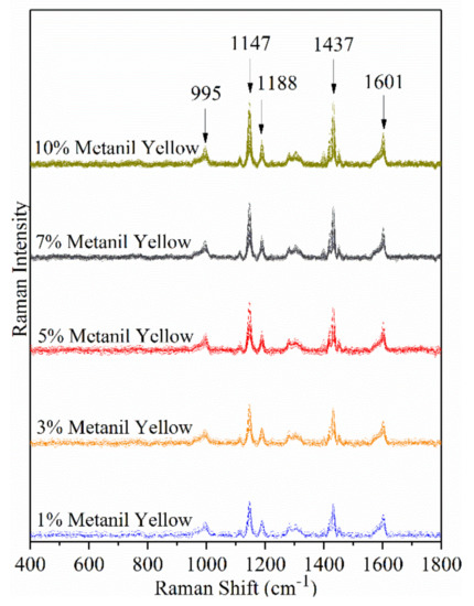 Raman spectra of detected metanil yellow pixels at five concentrations.