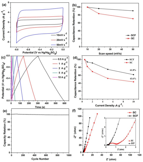 Electrochemical performances are measured in a three-electrodesystem using 5 M H2SO4 astheelectrolyte. (a) Cyclic voltammogram CV curves of SCF at different scanning rates; (b) Capacitance retentions of SCF and SC at different scanning speeds; (c) Galvanostatic charge-discharge GCD curves of SCF at different current densities; (d) Capacitance retentions of SCF and SC at different currents densities; (e) Cycling stability of SCF at 0.5 A·g−1; (f) Nyquist plots of SCF and SC electrodes in the frequency range of 0.01 Hz–100 kHz with the inset showing the high and middle frequency region.
