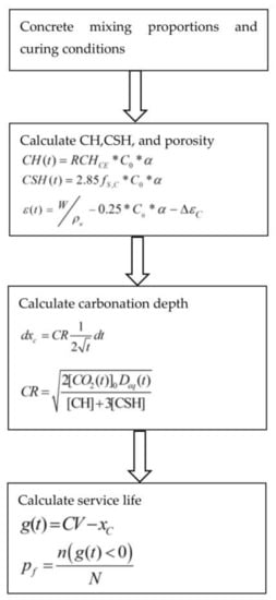 Figure 1 shows the flowchart of the proposed model. The input parameters of the proposed carbonation model consisted of the concrete mixing proportions and curing conditions, binder compound compositions, concrete specimen crack characteristics and carbonation environmental conditions. Based on the cement hydration-carbonation integrated model, the carbonatable substance contents, porosity and the carbonation depth of concrete can be determined. The effects of climate change on carbonation such as increases in CO2 concentration and environmental temperature, are considered using the difference method. The effect of cracks on carbonation was taken into account using the equivalent diffusion coefficient of CO2. Finally, by using the Monte Carlo simulation method, the probability of corrosion initiation and the service life of concrete can be calculated.