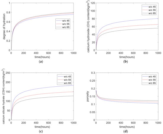 By using the kinetic cement hydration model [], the degree of cement hydration, CH content, CSH content and porosity of concrete were calculated and are shown in Figure 2. With decreases in the water to cement ratios, the available depositing space of the hydration products and capillary water concentration decreased and consequently, the degree of hydration was reduced (shown in Figure 2a). Concrete with lower water-to-cement ratios had higher CH content (shown in Figure 2b) and CSH content (shown in Figure 2c) and lower porosity (shown in Figure 2d).