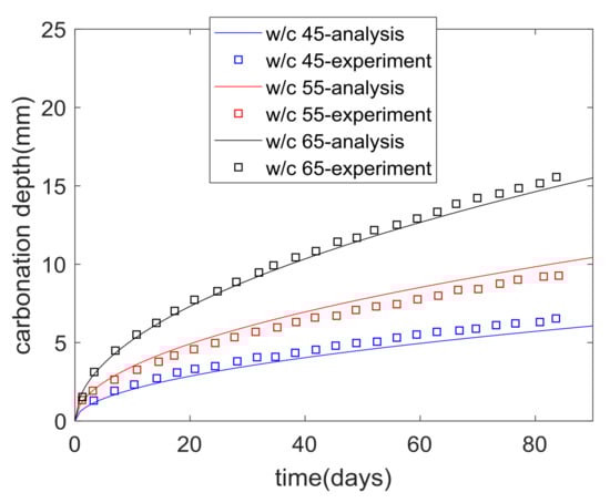 Experimental results from Song et al. [] were used to verify the proposed model. Song et al. [] conducted an experimental study on the carbonation of concrete with different crack widths and mixing proportions. The concrete mixing proportions are shown in Table 1. Concrete with high water to cement ratio represented low strength concrete. The concrete specimens were cured under water for 28 days at 20 °C. After curing, the specimens were put into a chamber at 65% RH for two weeks. Next, the concrete specimens were put into the CO2 chamber for accelerated carbonation testing (CO2 concentration was 10%, RH = 65%, temperature was about 25 °C). Splitting tests were used to induce 0.05 to 0.25 mm cracks into the concrete specimens.