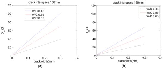 In Equation (7), the value of  is the ratio of CO2 diffusivity in the cracked and sound zones. With the increase of crack width  or decrease of crack interspace , the equivalent diffusion coefficient of concrete increases.