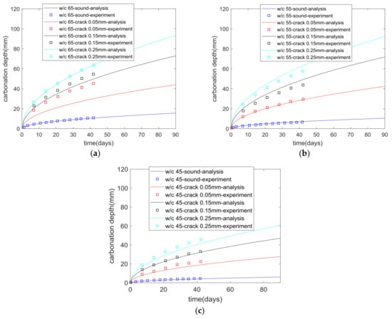 After this transformation, the effect of the curing period on CO2 diffusivity was considered. By using Equation (15) and the carbonation reaction (Equation (8)), the carbonation depth of cracked concrete with different curing periods could be calculated. In this study, we used equivalent CO2 diffusivity to calculate the carbonation depth of cracked concrete. As we considered the fundamental mechanisms involved in carbonation such as hydration, carbonation and equivalent CO2 diffusivity, the calculation could be carried out not only within the experimental period but also in the extension period beyond the carbonation experiment. Figure 5 shows that with the increase of water-to-cement ratio and crack width, the carbonation depth of concrete increased. As shown in Figure 5a, for concrete with a water-to-cement ratio of 0.65 and a 0.25 mm crack, after 42 days of accelerated carbonation tests, the carbonation depth was about six times that of sound concrete. While for concrete with a water-to-cement ratio of 0.45 and a 0.25 mm crack (shown in Figure 5c), after 42 days of accelerated carbonation tests, the carbonation depth of concrete was about ten times that of sound concrete. Hence, concrete with a lower water-to-cement ratio is more vulnerable to cracking than concrete with a higher water-to cement ratio. Given the same crack widths, for high strength concrete, when compared with sound concrete, the increase in carbonation depth was more obvious than that of low strength concrete. Additionally, as shown in Figure 5, the theoretical and experimental outcomes showed some deviations. This may be because the crack width used in the calculation may be different from the real crack width in the experiments. For example, when the used crack width in the calculation was 0.15 mm, the real crack width was between 0.1 and 0.2 mm.