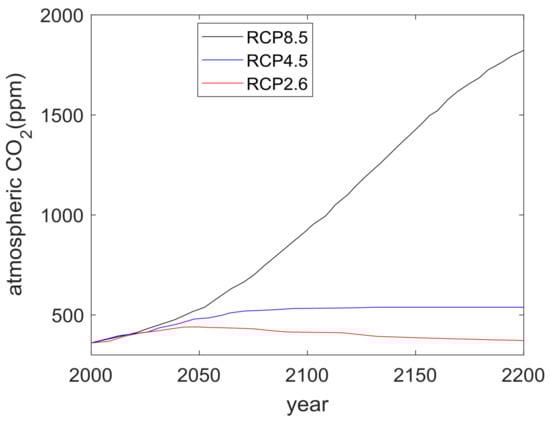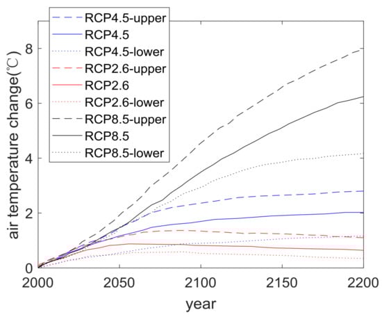 Climate models project the responses of numerous climate variables such as in global environmental temperature and sea level to different scenarios of greenhouse gas emissions and other human-related emissions. Of these different scenarios, the IPCC-AR5 scenario, which was proposed by the Intergovernmental Panel on Climate Change (IPCC), is considered as one of the best models for climate change []. Figure 6 shows the CO2 concentration increase. Representative Concentration Pathways (RCP) 8.5, RCP 4.5 and RCP 2.6 scenarios were considered in this study. RCP 8.5 projected higher CO2 concentration increases than RCP 4.5 and RCP 2.6. Figure 7 shows the temperature increase for different climate change scenarios. Both mean temperature rises and the upper and lower 90% confidence intervals of each scenarios are included in Figure 7.
