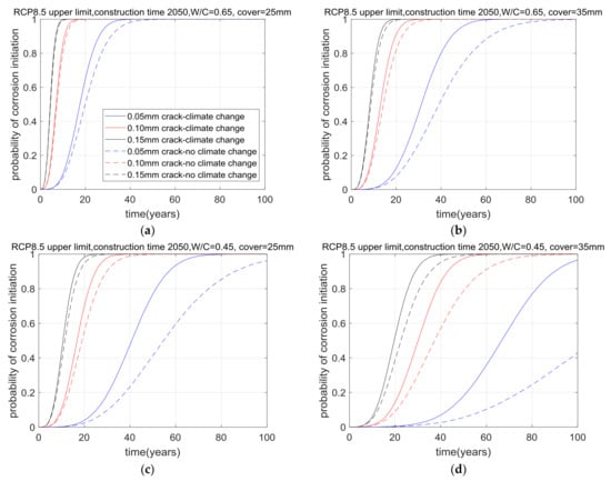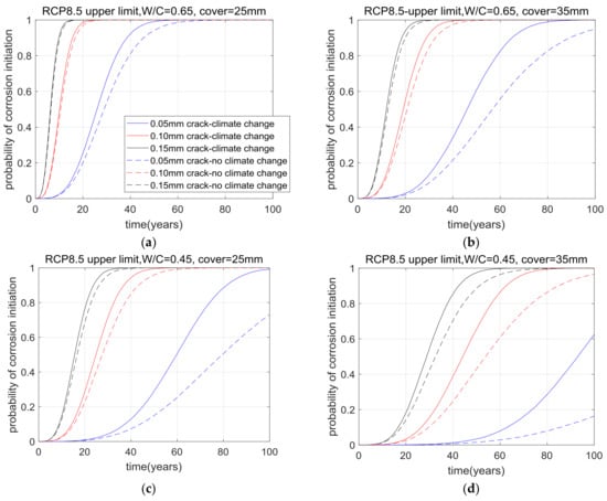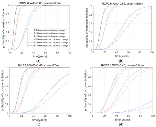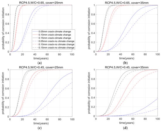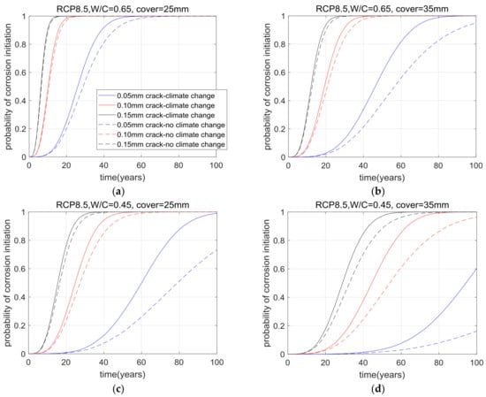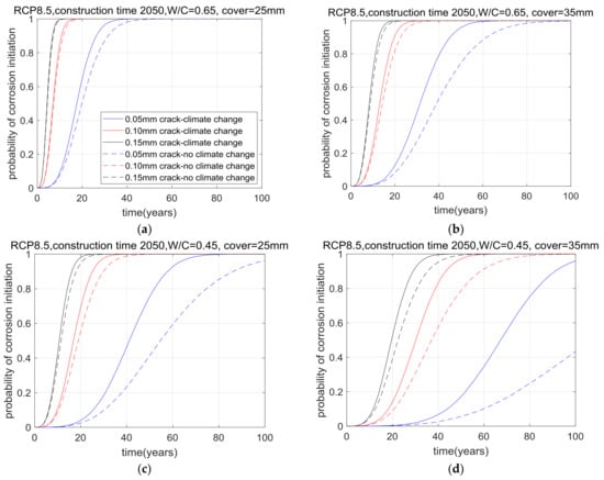 Based on the concrete hydration-carbonation integrated model, the carbonation depth of concrete could be calculated. Furthermore, by using the Monte Carlo method, the probability of corrosion initiation was determined. The probability of corrosion initiation for the analysis cases is shown in Figure 8, Figure 9, Figure 10, Figure 11, Figure 12 and Figure 13. With the increase in cover depth (seen in a comparison between Figure 8a,b and between Figure 8c,d), the probability of corrosion initiation decreased. With the decrease in water-to-cement ratio (based on a comparison between Figure 8a,c and between Figure 8b,d, the probability of corrosion initiation also decreased. Higher W/C with a lower crack width may present a lower probability of corrosion than a lower W/C with a higher crack width. In this study, we treated the water-to-cement ratio and crack width separately and did not consider the effect of water content on the chance of cracking.