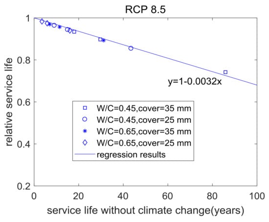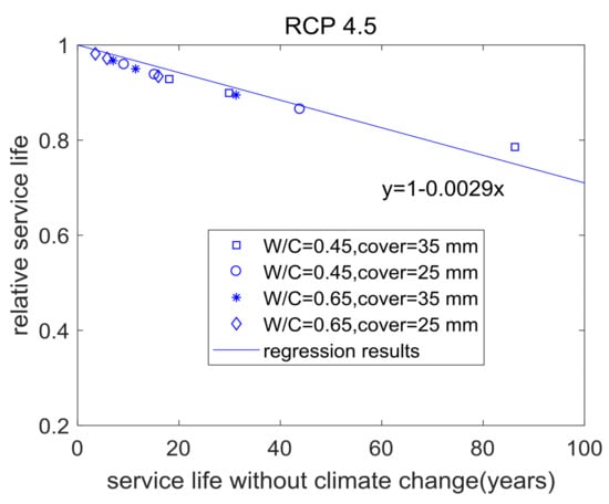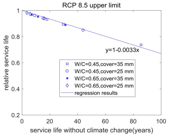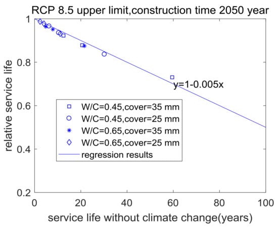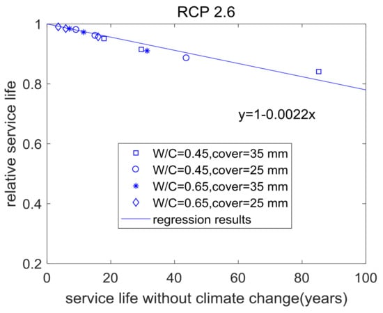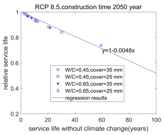 Figure 14, Figure 15, Figure 16, Figure 17, Figure 18 and Figure 19 show the relative service life for each case. Relative service life is expressed as a function of former service life. Given a certain analysis case, for concrete with different water-to-cement ratios, different cover depths and different crack widths, the relationships between relative service life and former service life were similar. When former service life increased, relative service life also almost linearly decreased. Hence, climate change presents more significant influence on the service life of more durable concrete.