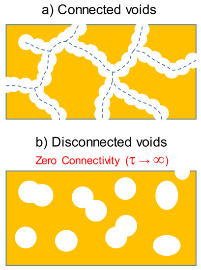 As voids become gradually narrower with decreasing porosity, the diffusion resistance increases; this causes a higher tortuosity and, thus, a lower connectivity. Therefore, in the limit case in which the volume of a narrow region becomes null, the diffusional path encounters a dead-end channel. If all channels become dead ends, the inner voids become completely disconnected islands (Figure 1b) and, thus, diffusional resistance and tortuosity become infinite (no diffusive flux possible).
