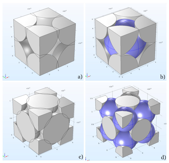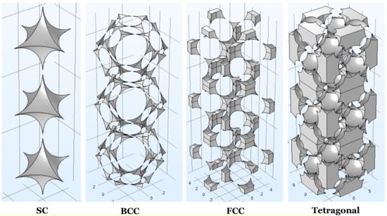 The structures investigated—Simple Cubic (SC), Face-Centred Cubic (FCC), Body-Centred Cubic (BCC) and CaF2-type (Tetragonal)—are described in Figure 2, where the overlapping case is shown for convenience of the reader. Such an overlapping/interpenetrating geometry can occur in some high-temperature thermal treating processes, such as particle sintering, and result in strength increase because of the reinforced ties given by interpenetration, but also porosity losses, due to the appropriation of void space made by growing grains.