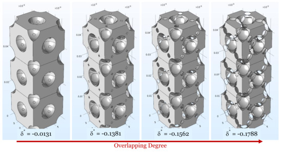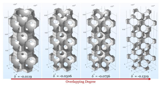 For simulation, the unit cells are stacked to form assemblies of three cells, in order to minimize numerical errors due to possible perturbations in the diffusive streamlines. As the morphology of the overlapping cases can be complex to visualise, we show the qualitative evolution of the structures from a lower overlapping degree (i.e., a lower negative value of δ*) to a higher degree (i.e., a higher negative value of δ*), as depicted in Figure 3, Figure 4, Figure 5 and Figure 6, where the solid volume represents the void interparticle volume.