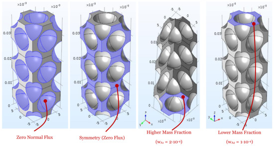 Figure 7 is a sketch of the boundary conditions set for simulation, for which the impenetrability of the particle walls (i.e., zero normal flux) is set along with symmetry (i.e., zero flux) on the flat lateral boundaries of the cell stacks, and concentration values on the respective bases.