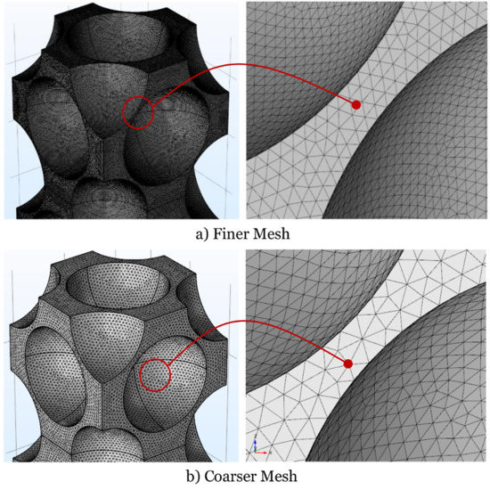 To do that, a preliminary test is performed by constructing two different meshes—referred to as coarser and finer—for the same non-overlapping FCC structure for a certain value of porosity sufficiently close to the condition of tangent particles (ε = 0.38319), which is the most severe condition for a mesh to be generated.