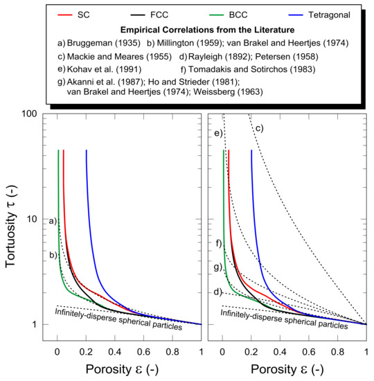 Figure 12 shows an overall comparison among the trend of all the considered structures along with several empirical expressions mostly used in literature to estimate the tortuosity of certain types of porous structures [44,45,46,47,48,49,50,51,52,53,54]. In particular, we can observe that some correlations among (a), (b), (d), and (g) describe partially well some of the trends calculated in the present work, with the goodness of the matching depending on the porosity range. Specifically, the expression of Bruggeman [47] describes well the SC trend for a porosity down to ca. 0.1. On the other hand, the Millington correlation [49], which is the same as that of Akanni et al. (1987) [53], Ho and Strieder (1981) [54], van Brakel and Heertjes (1974) [51] and Weissberg (1963) [52], represents satisfactorily the BCC trend in almost the whole porosity range and the FCC one within [0.25, 1]. All trends are well described by the Neale and Nader [27] theoretical expression within [0.55, 1]. Differently, the correlations (c), (e), and (f) do not represent satisfactorily any of the tortuosity trends calculated in the present work.