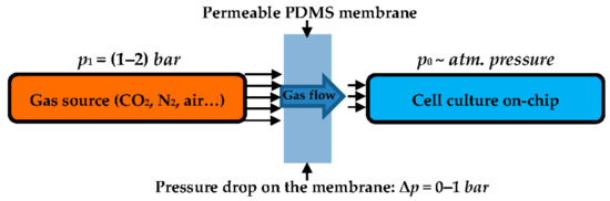 In our concept, the gaseous medium under pressure p1 permeates through the membrane and reaches the lab-on-a-chip under pressure p0, being approximately equal to the atmospheric pressure (Figure 1). The flow rate—for the fixed construction of the regulator—changes linearly with the pressure, the membrane surface, and its permeability, and is inversely proportional to the membrane thickness.