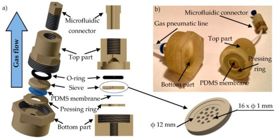 3D printed membrane-based gas microflow regulator: (a) on the left, exploded schematic view; on the right, cross section with magnified view of the sieve; (b) bottom and top part of the regulator prior to assembly.