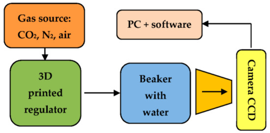 Gas sources of carbon dioxide (99.9%), nitrogen (99.99%), and air (99.99%) (Air Products, Warsaw, Poland) were delivered to the regulator through the pneumatic line equipped with a valve (Bibus Menos, Gdańsk, Poland) and precise reducer (Shimadzu, Kyoto, Japan). The flow value was indicated using a bubble detection method. The quantity of bubbles per time unit and their volume was detected at the regulator output using a digital microscope with CCD sensor (model: 23713, Bresser, Rhede, Germany). On the basis of the recorded image sequence, the flow was defined. The view of the measurement setup is presented in the Figure 3.