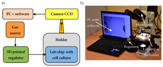Measurement setup for on-chip cell culture: (a) scheme; (b) real view.