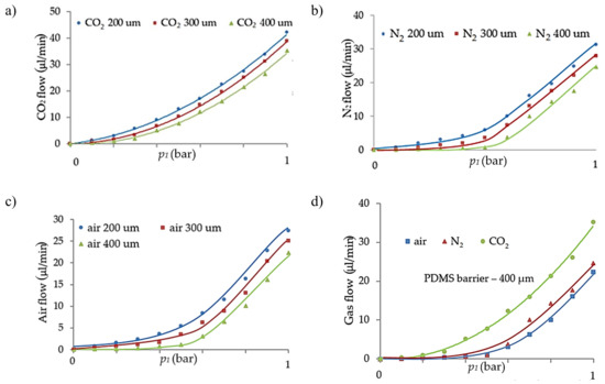 Gas flow characteristics of the regulator for different polydimethylosiloxane (PDMS) membrane thicknesses: (a) CO2 flow; (b) N2 flow; (c) air flow; (d) flow comparison for the selected gases with a 400 µm thick PDMS membrane.