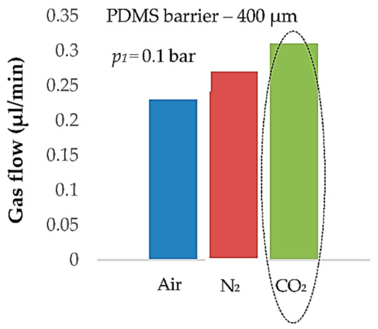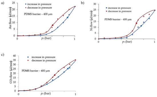 The statistical analysis showed that the flow changes parabolically with applied pressure, also depending on the membrane thickness. Diversities in the flow rate were also noticed depending on the type of gas. The shape of the characteristics (approximately parabolic) is consistent with the data found in the literature [31,32,33]. Obtained curves are, amongst other things, associated with an increasing solubility of gases as the pressure value increases. This phenomenon causes the growth of gas concentration, which slightly plasticizes the polymer bulk and increases permeability [31]. It is especially noticeable for organic penetrants, like CO2, and less for sorbing gases, such as N2 and O2. It justifies the characteristics presented in the Figure 4d, in which the flow value of CO2 increases the fastest with applied pressure. Another factor that points to a higher permeability is the molecule size; the flow value of CO2 in this case is the highest [33]. According to the formula (1) shown in the first section of the article, the flow ought to change linearly depending on the membrane thickness. In our case, the results depart from the linearity by circa 25%. The reason why such diversities were observed may be related to the preparation and polymerization of the membranes. The membranes were obtained by manual mixing of the prepolymer. In this way, the crosslinking network of each membrane could have had some irregularities, i.e., smaller or greater pores that influenced the flow characteristics. The measurements also revealed that the regulator exhibited pneumatic hysteresis (Figure 6). This phenomenon may be related to the gathering of gas particles in the polymer bulk and their gradual release. This could be reduced or even avoided by waiting a short time for stabilization after changing the parameters of the pressure.
