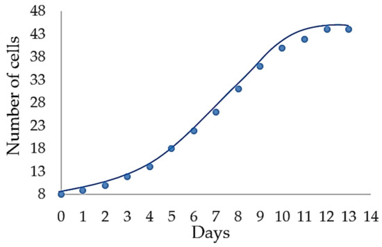 Characteristics of E. gracilis population growth on-chip: approximately parabolic dependence on time, consistent with the literature data [37].