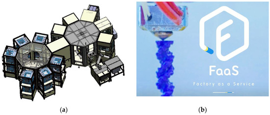 Many governments and manufacturing companies have been developing more automated and flexible systems, in order to provide customized products. In Germany for example, the Industry 4.0 strategy was announced, and the concept of the smart factory was introduced by integrating new ICT technology and manufacturing systems. With advanced ICT technologies such as the Internet of Things (IoT), cloud computing, data analytics, and 3D printers, we are able to develop new manufacturing and supply chain systems that are tailored to meet individualized requirements [7]. In such environments, equipment in a smart factory is connected by the IoT, and monitored and shared in a cloud system. When multiple factories are connected and shared, they become connected smart factories, or a web of smart factories. In a traditional manufacturing system, it may be difficult to share processes and facilities; however, in an environment of connected smart factories, it is possible to share factories in real time and create new business models [8]. Customers and other players in a supply chain can be connected and efficiently communicate through a cloud-based system. To test and implement the new supply chain, the EU implemented the ManuCloud project, to share the manufacturing capacity of production networks in the cloud architecture [9]. In Korea, connected smart factories with 3D printers supporting personalized production have been built in Daejeon, Gwangju, and other cities, and are managed in the cloud system under the name “Factory as a Service” (FaaS) [10]. Figure 1a shows the layout of the smart factory. 3D printers and post-processing facilities are located at the side of the octagon, while a robot arm in the center moves products. The factory in each city has interchangeable processes which can be shared when connected to the cloud system. Figure 1b shows the FaaS cloud system with which customers can upload computer-aided design (CAD) files of products, collaborate with engineers, and request production. The motivation for this research is a desire to develop a dynamic supply chain design and planning applications for connected smart factories, with additive manufacturing.