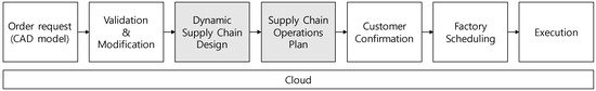Figure 2 shows the process for the smart supply chain from customer order to delivery of the product. First, the customer uploads a CAD file and requests an order via the cloud system using a website. Then, engineers supporting the system validate the CAD file, confirm whether the product can be made in the system, and provide feedback to the customer. At the same time, the required processes and bill of materials (BOM) are designed. Next, based on the design data, real time data about the machines in the processes are gathered from the IoT and monitored through the cloud system. After the required information—including availability of raw materials, capacity of resources, and working calendars—has been reviewed, the optimal supply chain design and operations plans are generated for a single order request by matching demand requirements and supply capability. Based on the decision, customers receive information on the facilities and processes that will be used, the production plan, and the delivery date. After confirmation from the customer, an operations plan is sent to the selected parties. Finally, each party in the supply chain develops his or her own schedule, and execution begins.