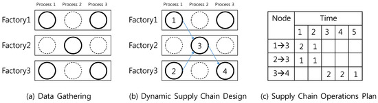 In the first step, based on the data gathered from the customer and factories, all possible processes in each factory are selected, as outlined in Figure 3a. In the example, three processes, namely Processes 1, 2, and 3, are required to produce the product. In addition, there are three available factories, namely Factories 1, 2, and 3, in the network. The nodes, represented by circles, show which process in which factory is available. A solid line indicates that the process in the factory is available, while a dotted line indicates unavailability. For example, Processes 1 and 3 in Factory 1 are available. After checking the availability, the optimal supply chain is designed. That is, the best combination of processes is selected in order to minimize the total cost and cover all required processes as shown in Figure 3b. Four processes in three factories are selected. That is, all three factories are sharing their resources to efficiently fulfill the current order. Process 3 in Factory 1 is not required to make the product, even if it is available. In the second step, optimal production and delivery plans are calculated using the processes selected in the previous step. Figure 3c shows the plan for each process.