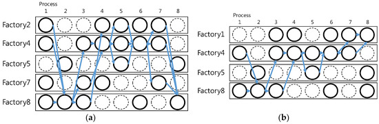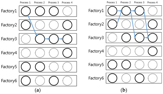 Next, the number of processes was fixed at eight and network-connected factories at ten, to investigate the effect of a change in capacity. Figure 6a,b show the structure of the supply chain that is designed for 20% less and 30% more capacity respectively. If capacity is small, more factories are needed for each process, which leads to a complicated supply chain design and an increase in cost. One interesting fact is that the supply chain or network of nodes with a larger capacity is not a subset of the supply chain with a lower capacity. Therefore, it should be emphasized that the dynamic supply chain design should be based on real-time data, including demand and available capacity.