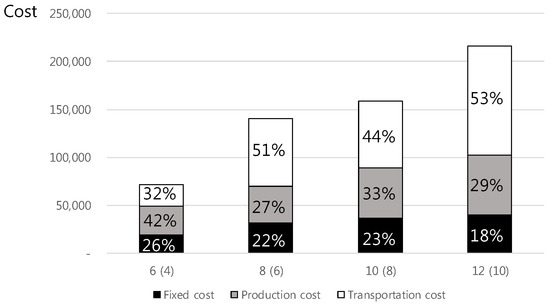 In this section, the results are compared, considering problem size and capacity change. First, the problem size is increased by introducing more factories and more processes into the process whereby production takes place. The number of connected smart factories is increased to 12, in two separate units. In addition, the number of processes is increased to 10, in two units. Demand is fixed at 100. In all cases, the computation time required to solve each problem was less than one second. In Figure 5, the number before the parentheses represents the number of connected smart factories, and the number within parentheses represents the number of processes required.
