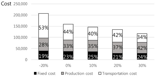 The cost structures of the experiments with factory capacities that vary from −20% to 30% are shown in Figure 7. If the capacities of the factories located in the network become smaller, it becomes impossible to allocate products to less expensive factories, which increases the total cost. Because a given product can be produced in a smaller number of factories at a lower cost, the fixed cost and production cost are somewhat lower, and the transportation cost decreases significantly. For example, when we have 20% less capacity, the percentage of transportation costs is 53%, while the portion of transportation cost decreases to 42% with 20% more capacity.