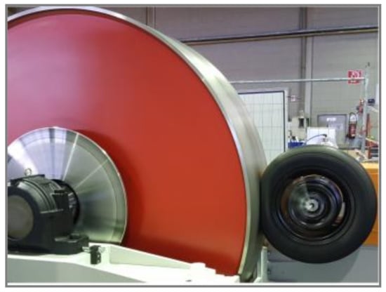 Testing a tire on a real runway still remains an expensive and difficult task, especially at high velocity. Therefore, drum-tire machines represent a suitable alternative. Tires could be tested in contact with the inner or the outer surface of the drum. The internal contact drum tests are frequently used to investigate the influence of the tread pattern design, tread groove, water depth, cornering and braking force capability of the tire on a wet runway. External contact drums with diameter of 1.8 m or 2.0 m are usually used to measure the rolling resistance of vehicle tires (Figure 1). The rolling resistance measured on these test rigs is higher than the rolling resistance measured on a flat surface. This deviation is caused by the drum’s curvature. Clark et al. [10] developed a model, which converts the rolling resistance of a tire measured on a curved surface into the corresponding rolling resistance on a plane runway. Indoor laboratory drum tests are generally run on large diameter drums, at an ambient temperature of 23 °C. Most industry high speed tire tests call for 80% of the maximum loading. In these tests, in order to avoid tire wear, velocity increases by 10 km/h every 10 min increment until the specified speed is achieved. Inflation pressure varies according to the tire type and velocity rating. The reduced pressure is an adjustment to obtain an equivalent tire deflation on the drum’s curved surface to the one expected on a flat runway surface.