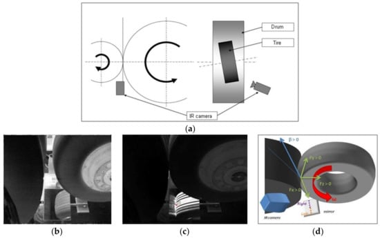 (a) Experimental set-up (b) tire position, view camera/before loading, (c) tire position, view camera/after loading, (d) mirror and infrared camera positions.