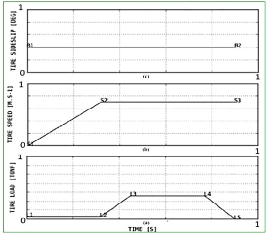 The influence of the vertical loading was investigated in an analogous way as it can be seen in the Figure 9, the tire was loaded with five different values: l1, l2 = l.5 × l1, l3 = 2 × l2, l4 = 1.3 × l3, l5 = 1.3 × l4, for a fixed velocity s3 lower than 120 km/h and a constant skidding angle of 6°.