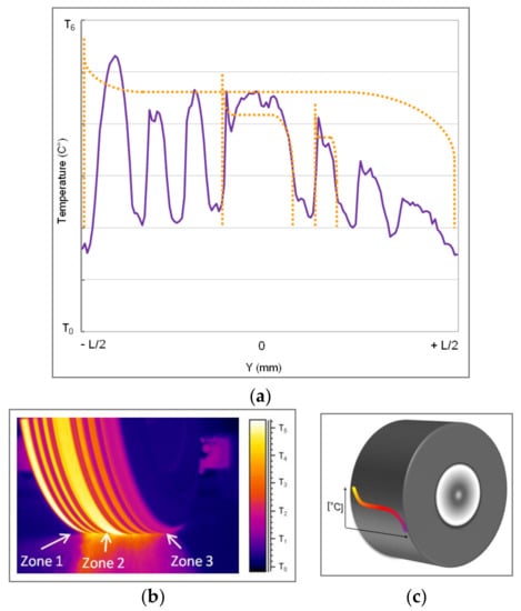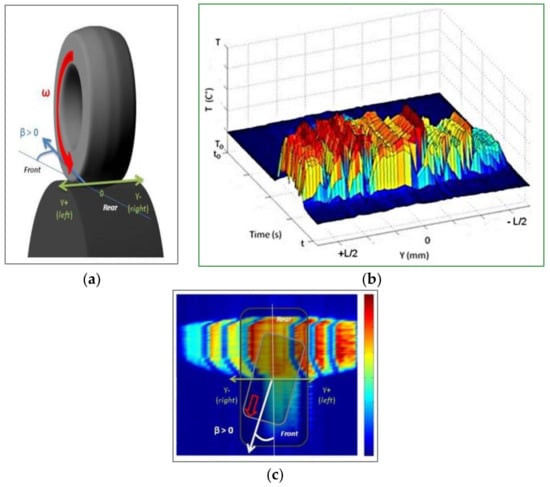 Figure 4a shows the tire/drum configuration. The origin of the coordinate system was chosen to be in the middle of the tire. Thus, the left side corresponds to positive Y values and the right side to negative Y values (Figure 4c). 30 points for each side of the tire tread were used to record the thermal evolution. Figure 4b shows the temperature distribution as a function of the point position within the tire tread profile. These point positions are given by the Y coordinates, varying from −L/2 to +L/2, where L is the tire width. All the data treatment was performed using MATLAB™. For angles greater than 8° and loadings over 170 kN, the tread overpasses the drum edge. For safety and wear reasons, the test campaign was limited to angles smaller than 10°.