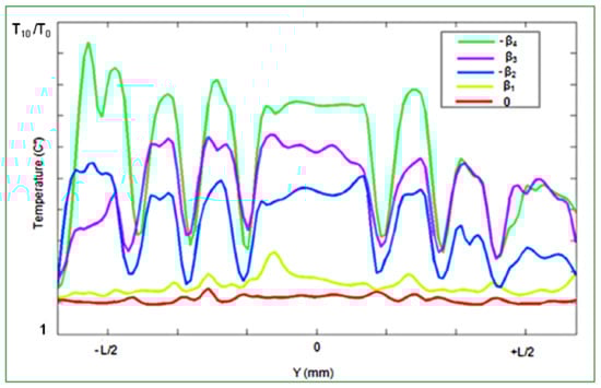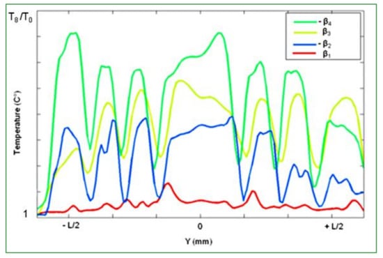 As it can be seen in Figure 5, increasing the slip angle leads to a temperature rise of the tire tread. For very small angles from 0° to β1, the heat amount is about 10 °C. Increasing the skidding angle from β1 to −β2, leads to a significant heating, more than 50 °C. The amount of heat decreases for higher β3 and −β4 angles. All these temperature profiles present a rising or descending slope of heating depending directly on the sideslip angle orientation.
