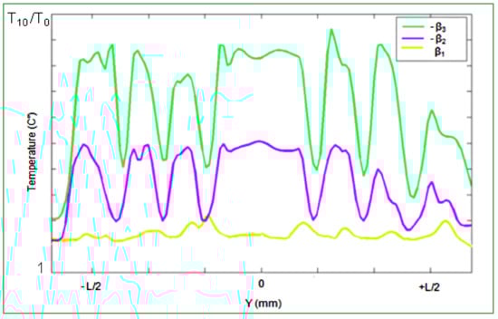 The same angle variation was used for a higher loading l3 = 260 kN. The thermal evolution presents a higher temperature compared to the first case were the loading value was only l3 = 200 kN (Figure 5). It can be noted that in the case of high loading (Figure 6), the effect of the skidding angle is still significant. The same considerable heating could be seen passing from β1 to β2. The next changes in β produce the same effects, with almost the same mean temperatures, but the temperature distributions change from ascending-descending slopes to plateau-like shapes.