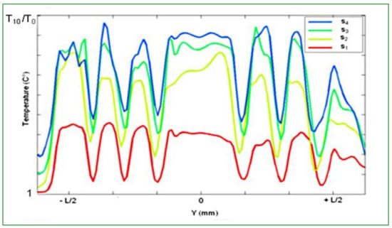 Temperature variation of tire tread for a constant loading of 200 kN, at a given skidding angle of 8° and for four different velocities: s1, s2 = 3 × s1, s3 = 1.6 × s2, s4 = 1.4 × s3.