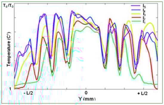 As it can be seen in Figure 9, the variation of the vertical loading has a direct influence on the thermal evolution of the tire tread, but the variation in temperature levels seems to be smaller than those induced by the skidding angle. For loadings lower than 100 kN (l1, l2), the vertical load seems to be not high enough to influence the whole contact patch; it could be related to the tire structure, which is designed to operate at high loading. For loadings beyond 260 kN (l4, l5), no major influence of the vertical loading is noticeable. The amount of heat induced by loadings l4 or l5 over the heat level of loading l3 is lower than 10 °C.