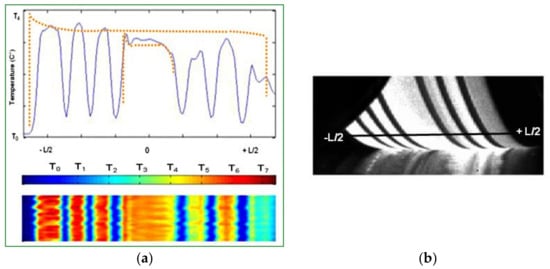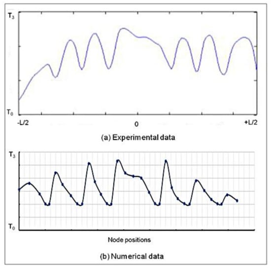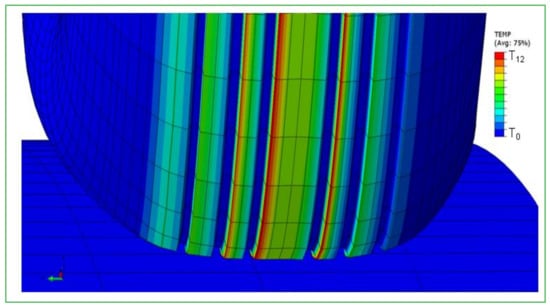 Figure 20 illustrates the temperature distribution along the cross section of the tire tread. Figure 20a represents the experimental data along the interface of the tire tread where the measurement was performed; the numerical results presented in (Figure 20b) show the thermal evolution along the entire contact interface. The good correlation between numerical and experimental data shows that numerical simulation could predict the thermal evolution of the tire rolling at velocities up to 114 km/h.