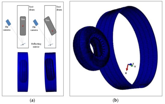 (a) The tire position on the drum at skidding angles at 0° and 6°, (b) numerical simulation, tire/drum set-up.