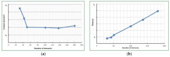 (a) Variation of contact area as a function of the number of elements, (b) computational time (CPU) as a function of the number of elements.