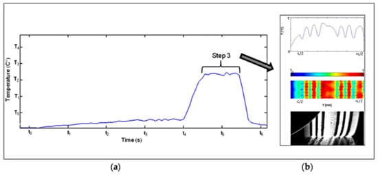 Experimental data, tire rolling on a steel drum, loading with 200 kN, velocity up to 114 km/h, skidding angle = 6°, (a) global temperature evolution of tire tread during the four steps of testing (Figure 3), (b) temperature of the contact zone, infrared camera recorded during 1.5 s of the step 3.