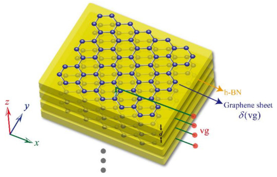 The field distributions of the multilayer structure composed of graphene and h-BN are numerically calculated by the software COMSOL, which is based on the finite-element method. Specifically, a perfectly matched layer around the material is used to avoid the boundary reflection in Figure 3. Furthermore, in our paper we consider a 2D structure where the y direction is regarded as infinity. So, the surfaces of shown in Figure 3c,d are same for any cross section along the y direction.