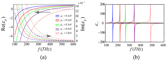 where 1 nm and are the thickness of graphene and the permittivity of the vacuum, respectively. For the varied chemical potential , the different effective complex permittivity values of graphene based on Equation (4) are shown in Figure 2a. The real and imaginary parts of are marked by solid and dashed lines, respectively. We can clearly find that the complex value of is sensitive to the value of , and the real part of has a redshift with the value increased. Owning to the flexibly regulated , the active topological transition of dispersion can be easily realized. Considering the graphene/dielectric multilayer structure, the components of the effective dielectric permittivity tensor parallel () and perpendicular () to the anisotropic axis are given by the effective medium theory [38]: